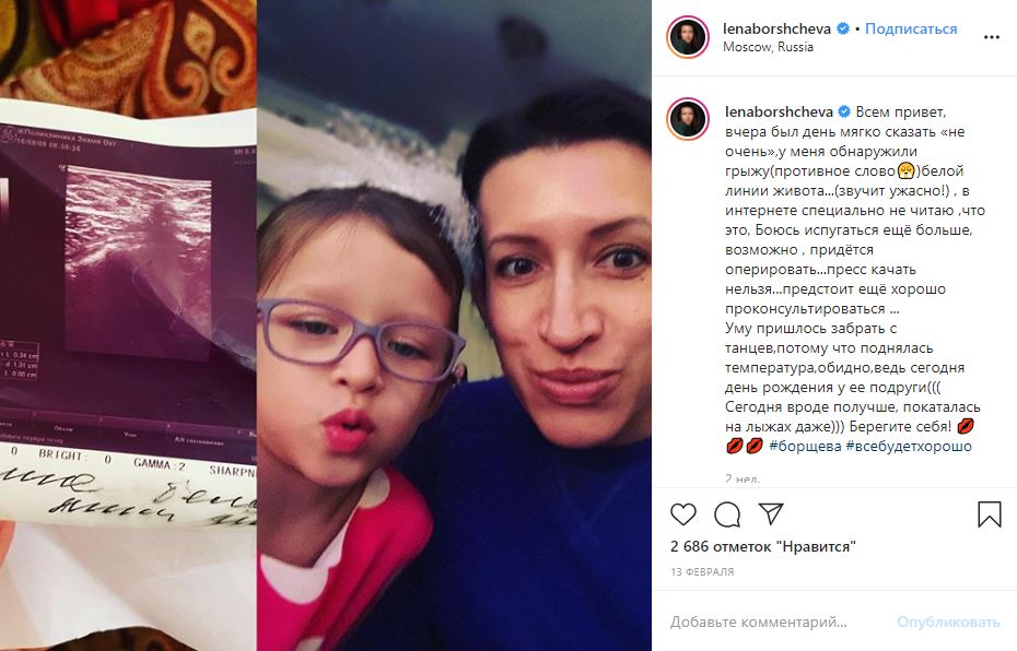 «Всем привет, вчера был день, мягко сказать, „не очень“. У меня обнаружили грыжу (противное слово) белой линии живота… Звучит ужасно! В интернете специально не читаю, что это, боюсь испугаться еще больше. Возможно, придется оперировать», — написала артистка.