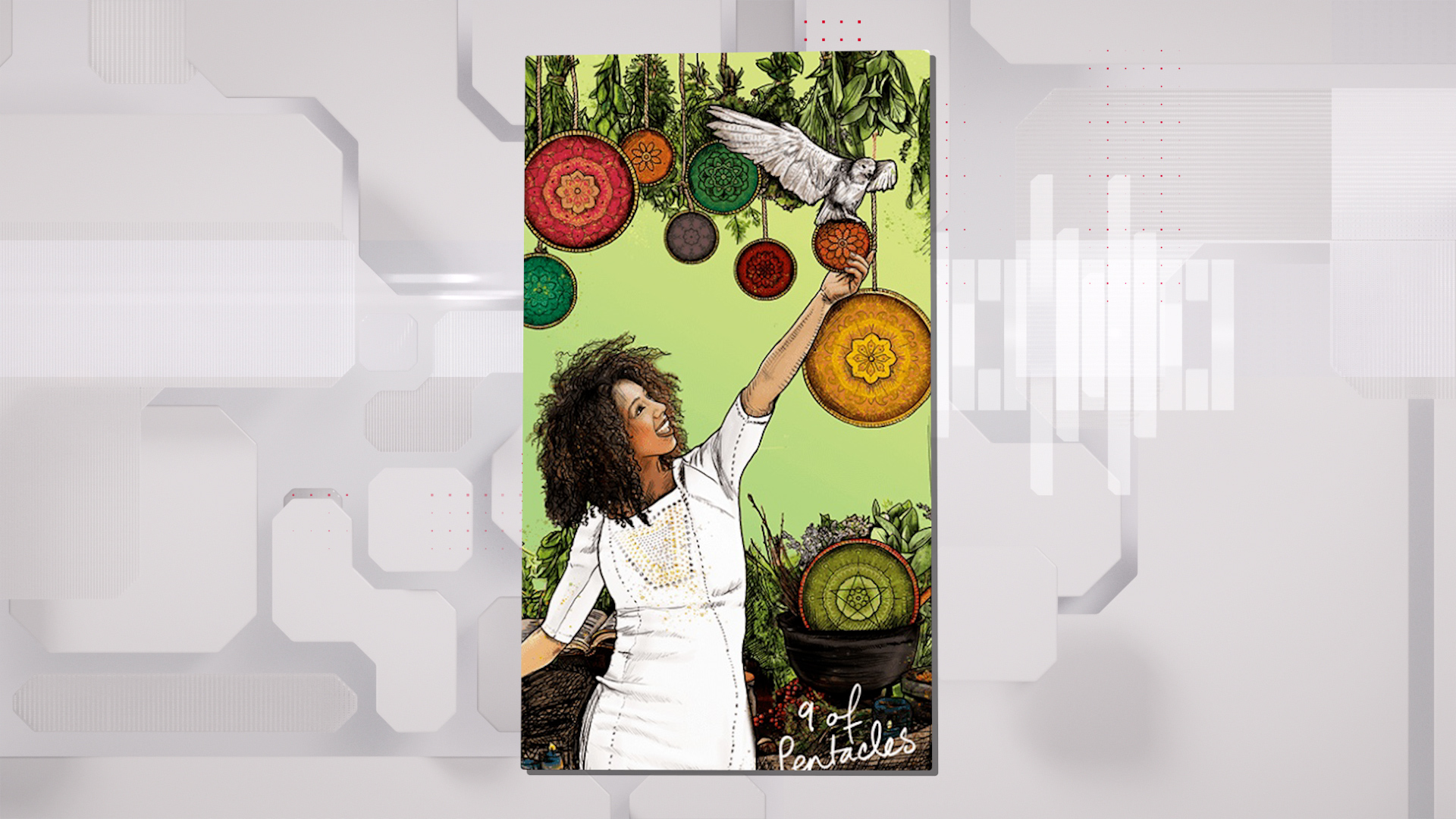 Карта Девять Пентаклей — символ благополучия, зрелых доходов, независимости, удовлетворения.