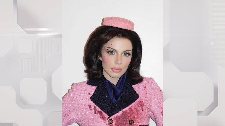 Звезда показалась в костюме, который был на Жаклин в момент убийства ее супруга. Экстравагантная модель использовала детали, среди которых были искусственные кровавые брызги на лице и одежде.