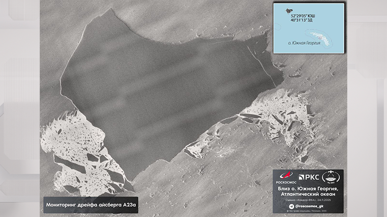 «Роскосмос» 1 декабря представил спутниковые снимки айсберга А23а, дрейфующего в Атлантическом океане и считавщегося крупнейшим на планете.