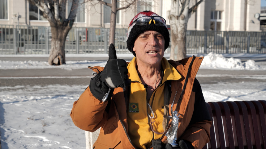 «Привет, Волгоград! Россия очень хороша! Я из Бразилии! Где Волга?» — говорит путешественник.