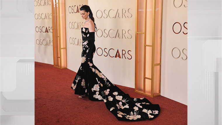Наряд представлял собой модель без бретелей с богатой цветочной вышивкой и длинным шлейфом силуэта «русалка». Образ дополняли черные перчатки, а также украшения ювелирного дома Bulgari — серьги и массивное колье с бриллиантами.
