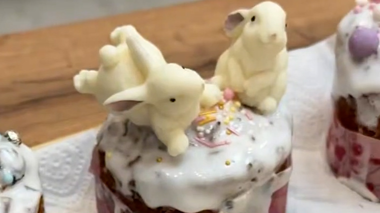 В набор вошли три огромных кулича. Один из них украшали два шоколадных зайца, а другой — небольшая белая птичка.