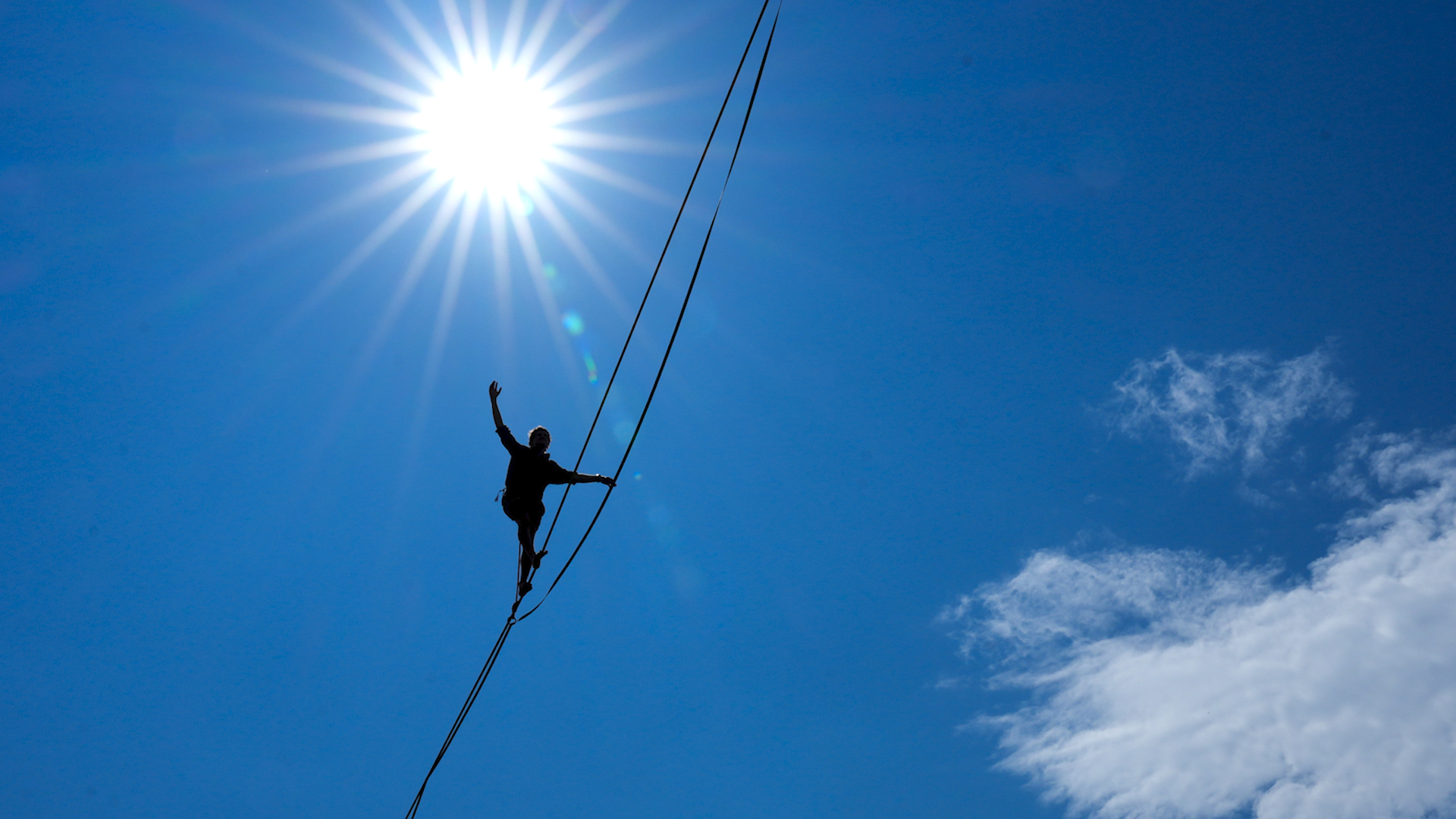 Номер с балансировкой на тросе заставила зрителей высоко поднять головы и высматривать смелого атлета под палящим солнцем.