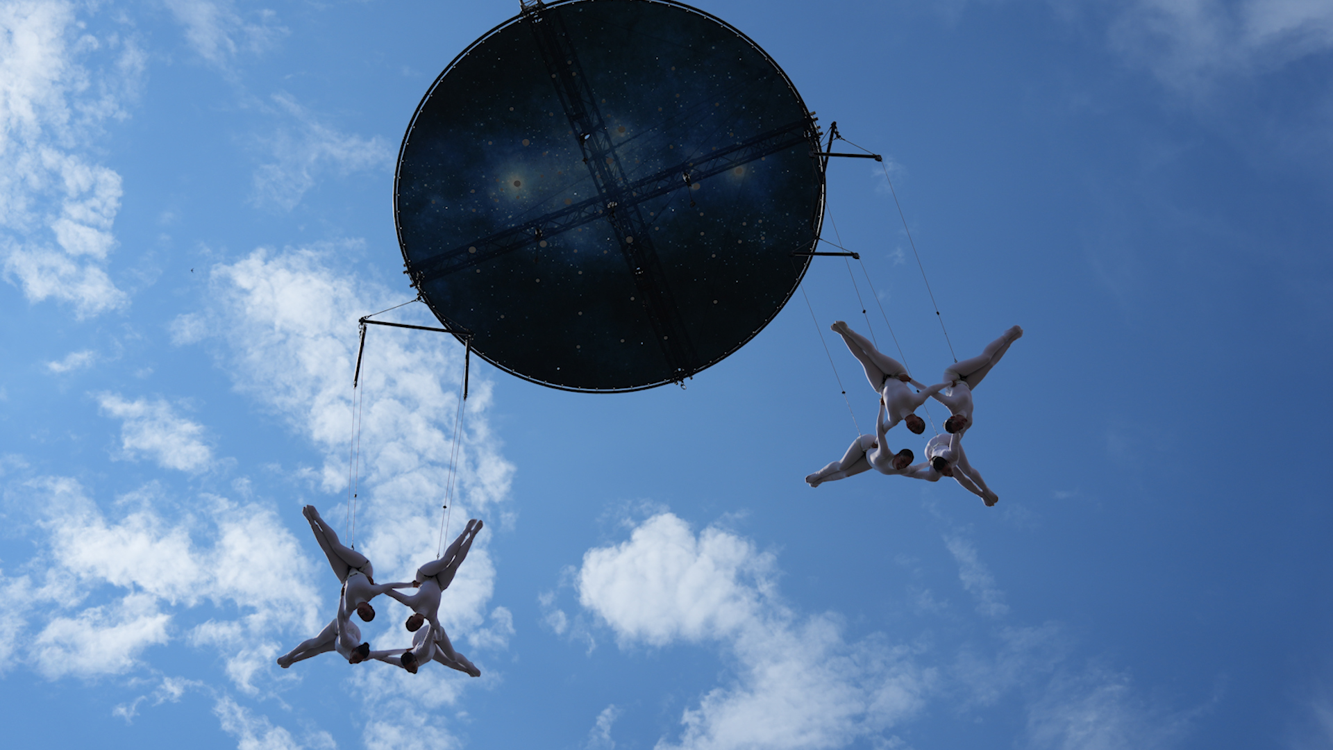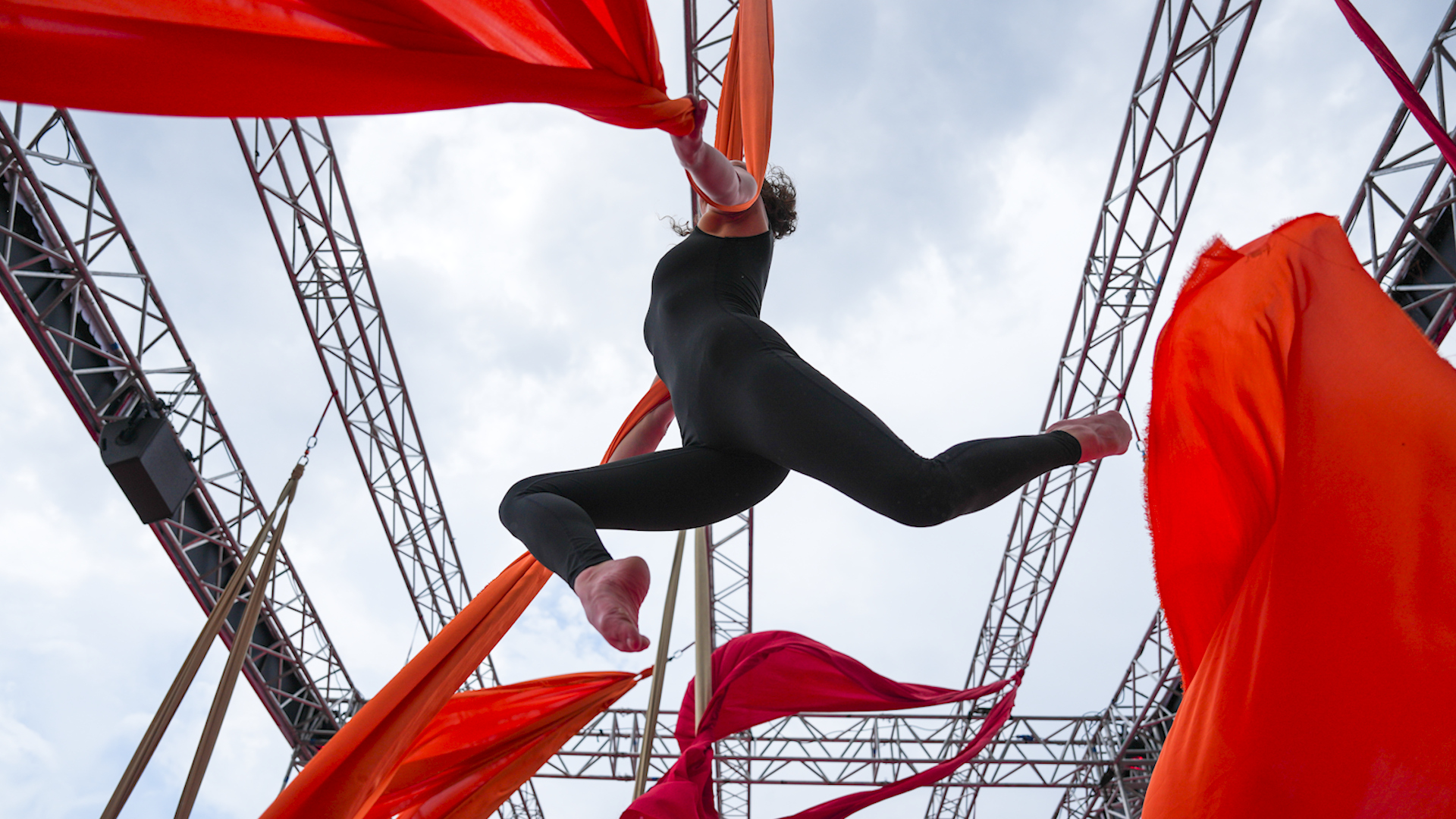 54 воздушных гимнаста синхронно выполнили сложный акробатический номер на длинных шелковых полотнах, закрепленных на высоте.