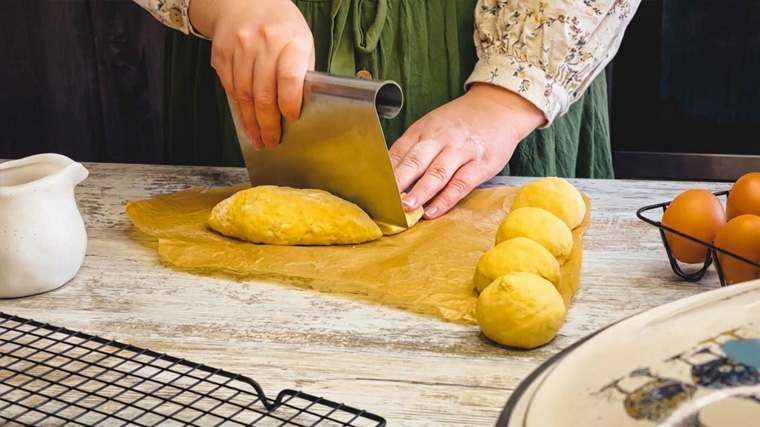 Затем тесто нужно разделить на восемь частей и скатать каждую в шар. Далее выкладываем шарики в керамическую форму, смазанную маслом, и оставляем на расстойку на 40 минут. Затем смазываем будущие булочки яичным желтком и отправляем в разогретую духовку на 30—40 минут.