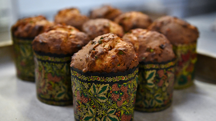 - Разогреть духовку до 170 градусов. Выпекать куличи 30 минут (для больших форм — 40-50 минут). Проверить готовность зубочисткой. Остудить готовые куличи.
